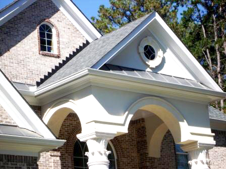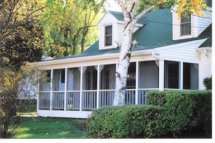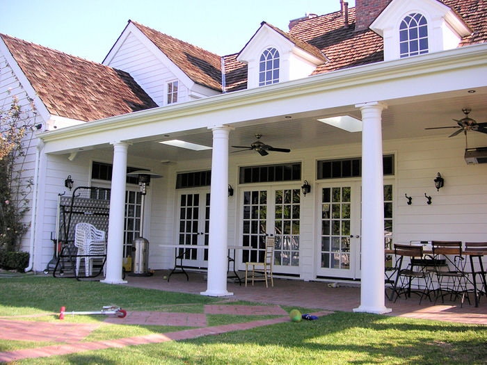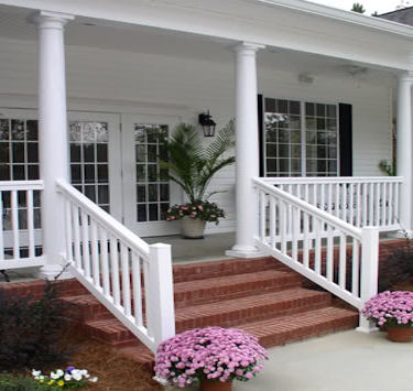 Country style front porch addition complete with round support columns and white picket knee wall(railing).