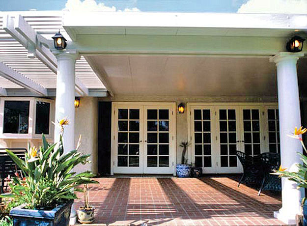 Beautiful mixture of old world Greek style column solid cover with modern ultra lattice pergola flanking the left all made with heavy gauge durable aluminum.