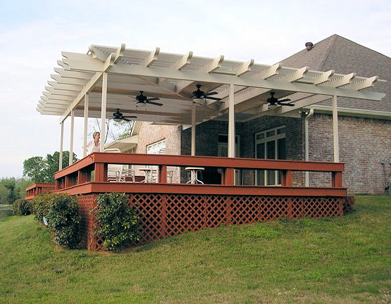 Stylish and spacious lattice wrapped cedar finish deck addition on modest slopping yard and beige ultra lattice pergola with two tier scallop end cut rafters and multiple ceiling fans.