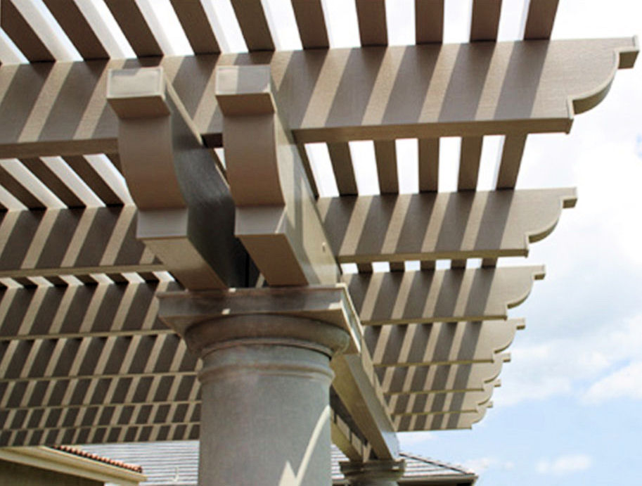 Great close-up view of ultra lattice pergola in beige showing corbel end cut rafters, lattice, real wood like texture and round columns.
