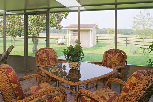 Peaceful screen room interior complete with wicker patio furniture skylight column all with a beautiful country farm field view.